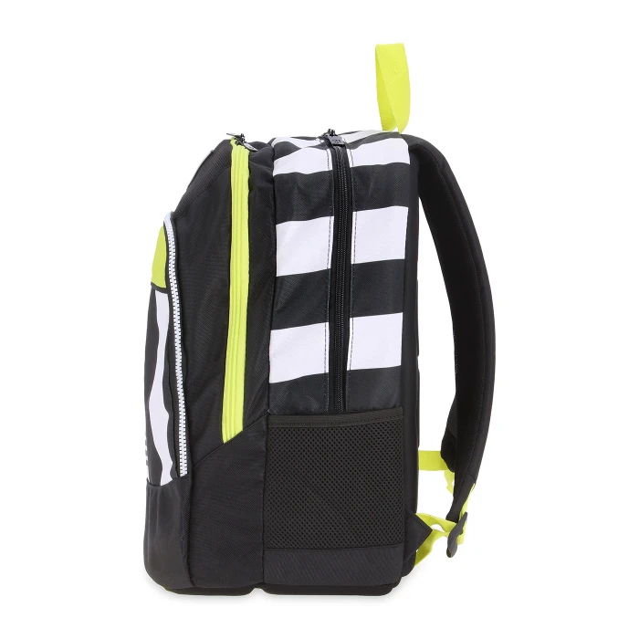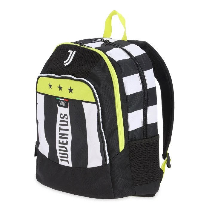 Double-compartment backpack with a front pocket and a side mesh bottle holder pocket. Internal laptop pocket. Nylon zipper and contrasting plastic zippers with custom zipper pulls. Rubber logo patch applied to a padded mesh panel, digital print and screen printing of JUVENTUS, woven label applied. Dimensions: cm 29,5 x 40 x 22.