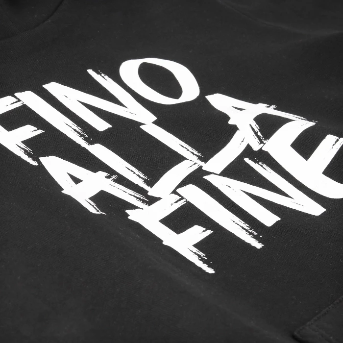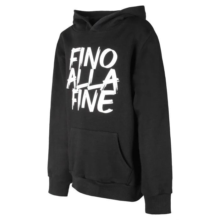 Hoodie in 100% cotton, black colour, with kangaroo pocket and contrasting central FINO ALLA FINE print, embellished with the Juventus logo on the hood.