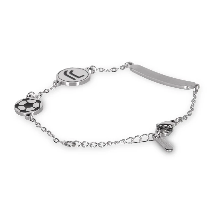 Stainless steel bracelet for kids with enamelled J logo and soccer ball. Adjustable: min. 15 cm, max. 17.5 cm.