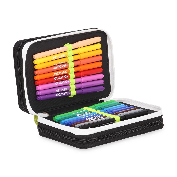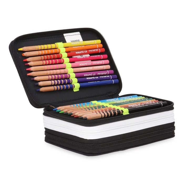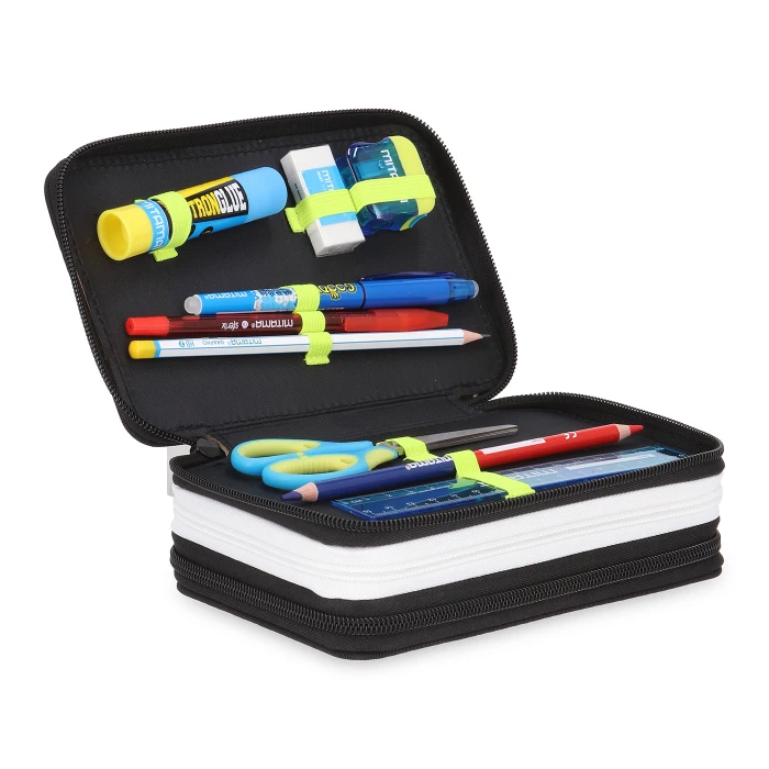 Three-compartment pencil case with elastic pencil holders. Nylon zipper with custom zipper pulls. Rubber logo patch applied to a padded mesh bottom, digital print, woven label applied. Dimensions: cm 12,5 x 20 x 7.